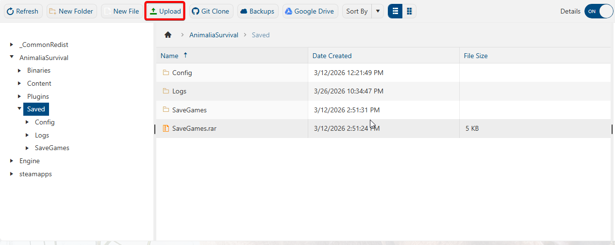 "<Home>/AnimaliaSurvival/Saved". Upload the SaveGames.rar