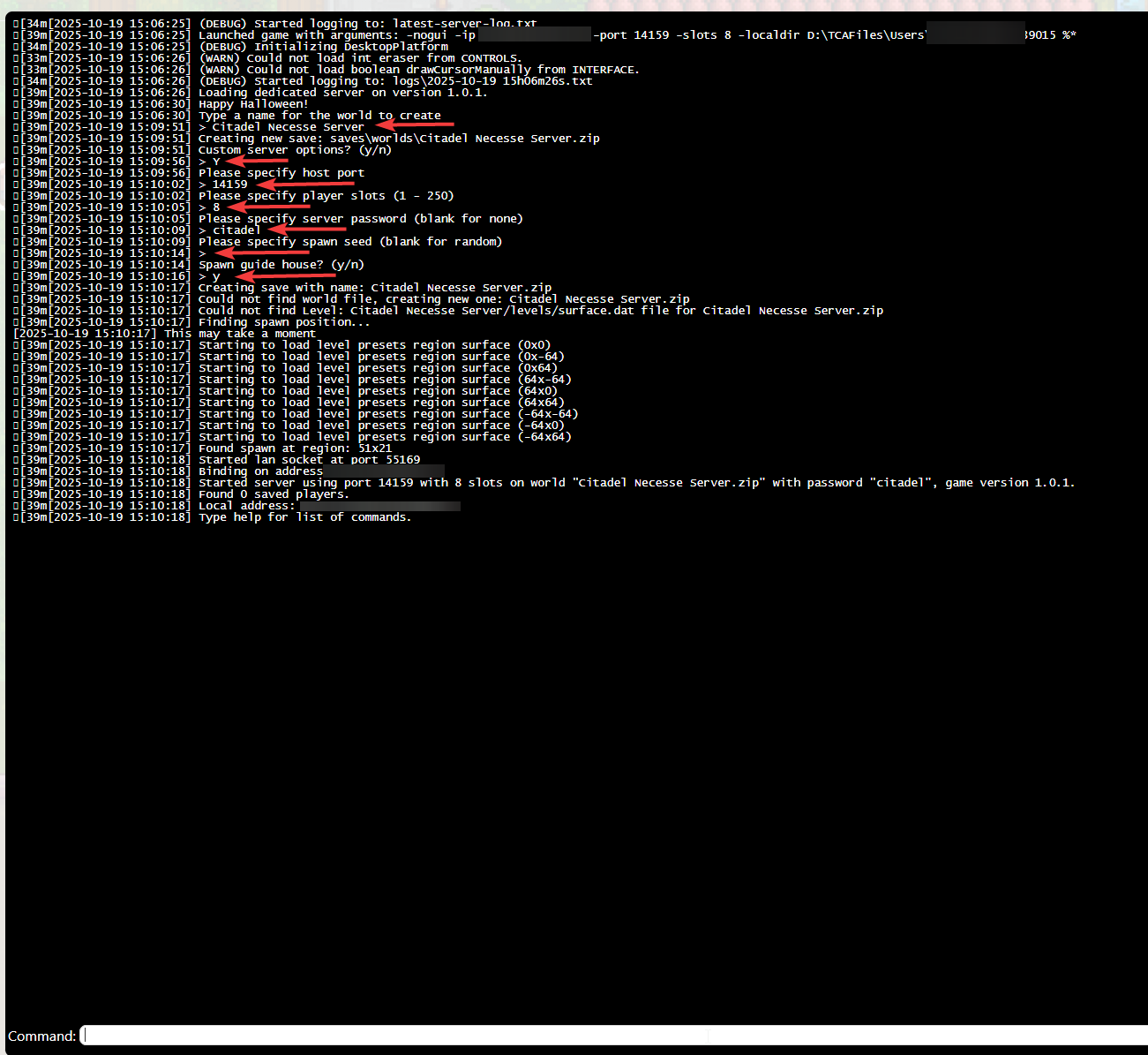 4. Open the Web Console tab. The world requires an initial setup on server startup.