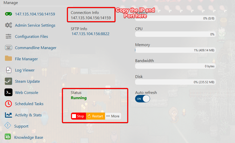 3. Start the server and copy the IP and Port in the Connection Info tab.