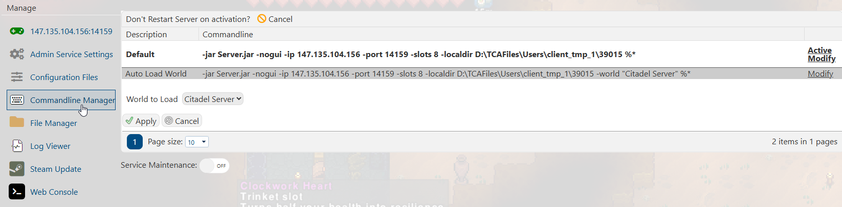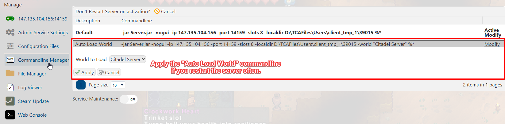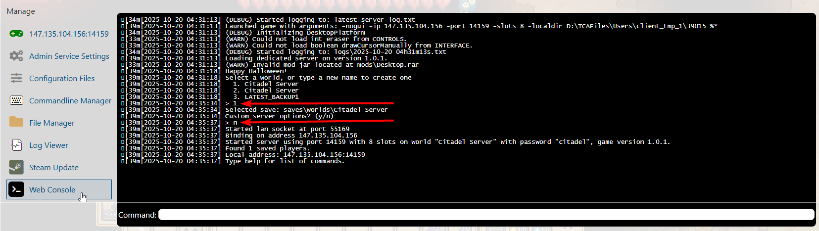 The server will now automatically load this world and will no longer require input in the Web Console.